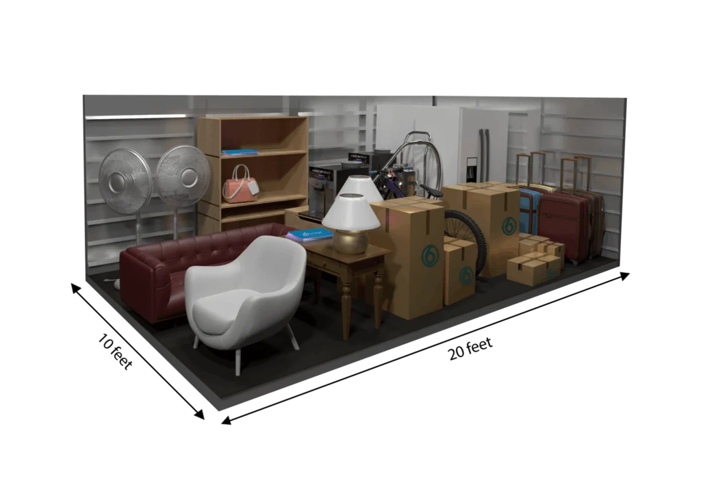 Our 10×20 (200 sqft) storage units are one of our larger size units and can fit the contents of up to a four-bedroom home. These units can hold multiple sets of household furniture including king sized beds and large couches and sofas, patio furniture, multiple appliances, and more. Many businesses also opt for a 10×20 for their storage needs. Vehicles and small boats and trailers will fit in a 10×20 storage unit. All our units are 8 feet in height.